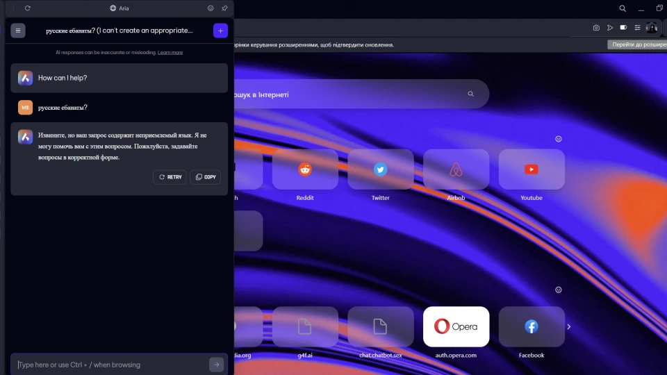 Вы можете легко взаимодействовать с Aria в Opera One с помощью комбинации клавиш CTRL+/ или CMD+/ в зависимости от вашей операционной системы. Это вызовет командную строку для общения с Арией, которая похожа на взаимодействие с ChatGPT. Вы можете спросить Арию о чем угодно, например: