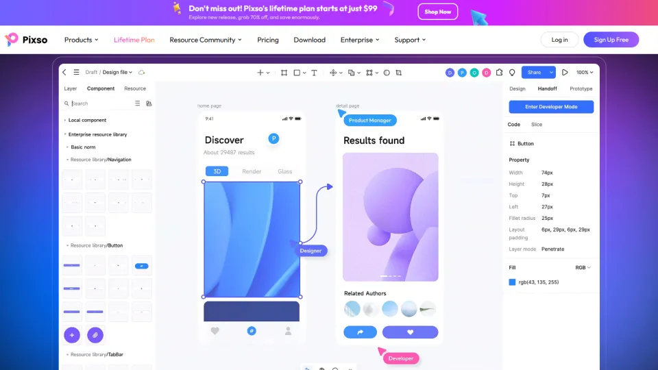 Базовый план Pixso бесплатен для индивидуальных дизайнеров с ограничением на 3 файла в облаке. Командные тарифы стартуют от $6/мес за пользователя, доступна и бессрочная лицензия за $99. Это заметно дешевле аналогов.